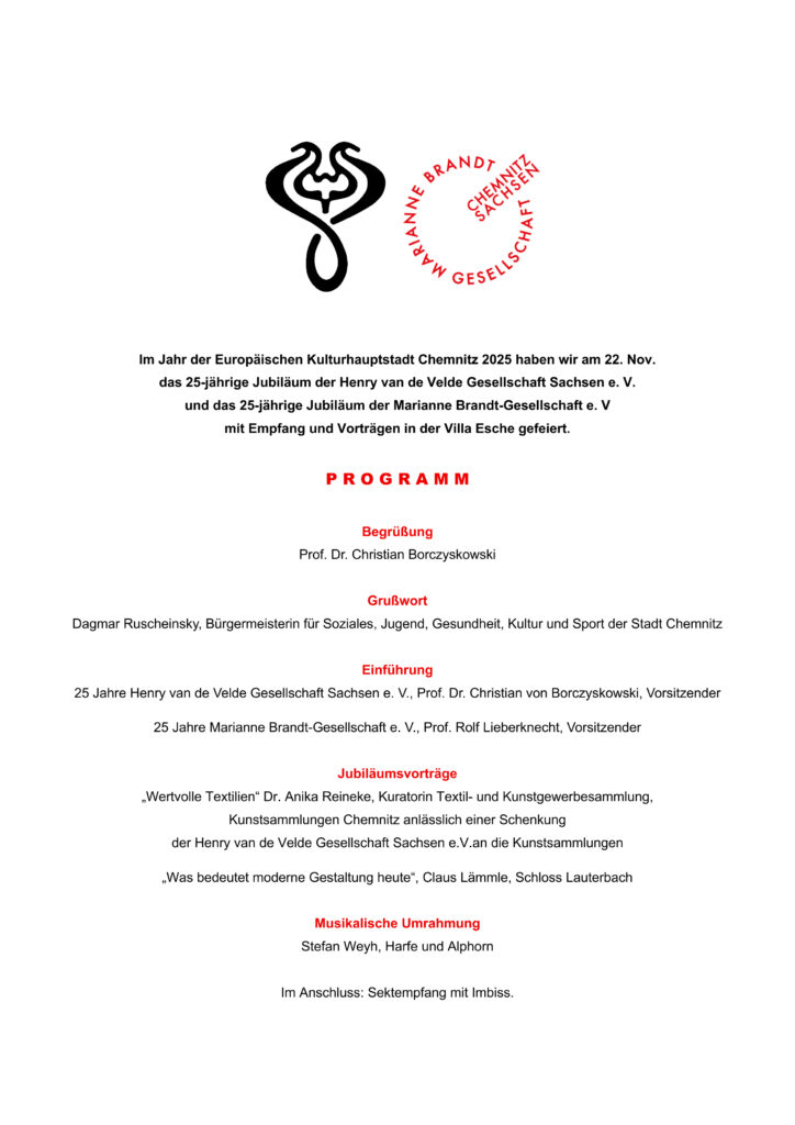 • 22. November 2025 – Feier: 25 Jahre Henry van de Velde Gesellschaft Sachsen e. V. und 25 Jahre Marianne Brandt-Gesellschaft e. V.